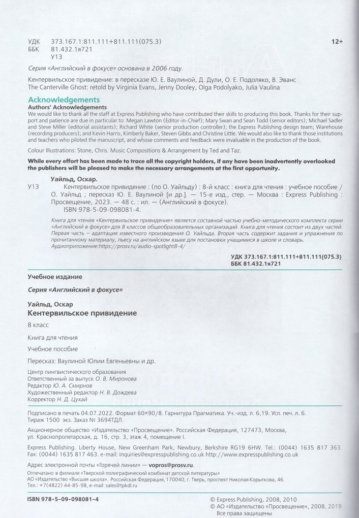 Книга для чтения «Кентервильское привидение» является составной частью учебно-методического комплекта серии «Английский в фокусе» для 8 классов общеобразовательных организаций. Книга для чтения состоит из двух частей. Первая часть – адаптация известного произведения О. Уайльда. Вторая часть содержит задания и упражнения по прочитанному материалу, пьесу на английском языке для постановки учащимися в школе и словарь.